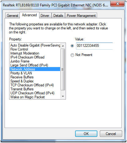 5. Dentro de la pestaña buscamos el campo “Network Address” y especificamos el valor hexadecimal que tendrá como dirección MAC nuestra placa.